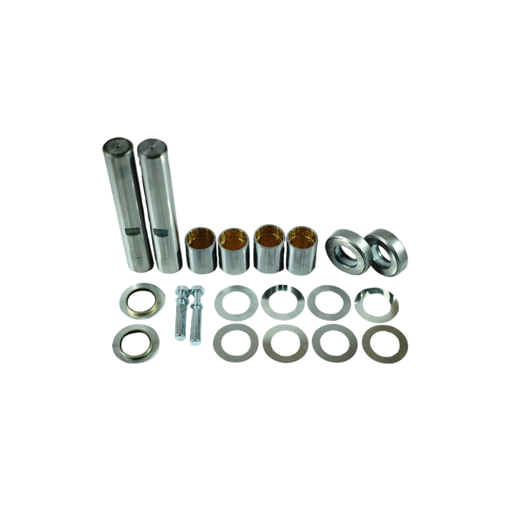 Kit de pivote completo para sistemas de suspensión y dirección. Fabricado con pasadores en acero y bujes bimetálicos, ofrece gran resistencia al desgaste y un ajuste preciso para un desempeño confiable.