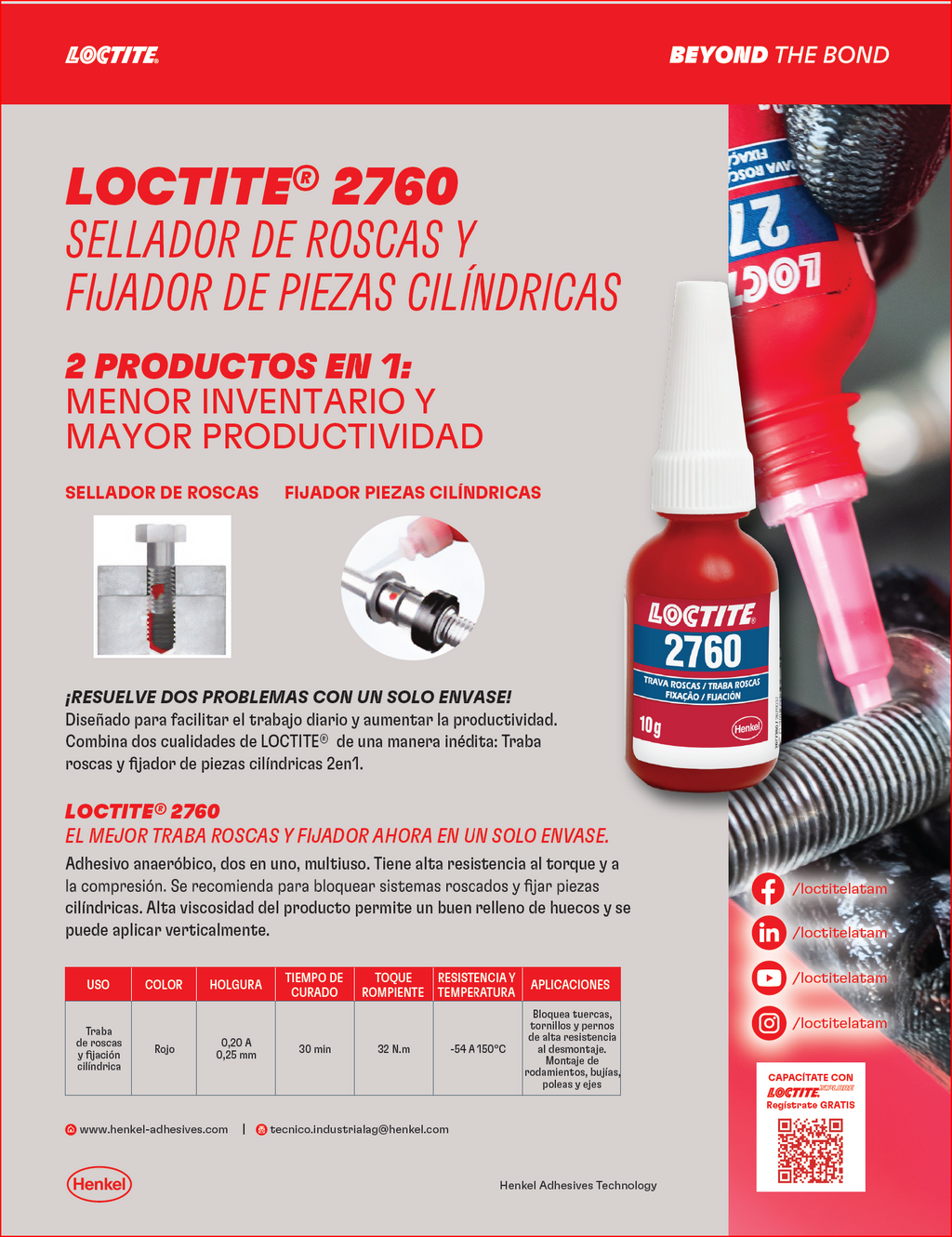 El LOCTITE® 2760 es un adhesivo anaeróbico 2 en 1, diseñado para reducir inventario y aumentar la productividad. Combina las propiedades de traba roscas y fijador de piezas cilíndricas en un solo envase.