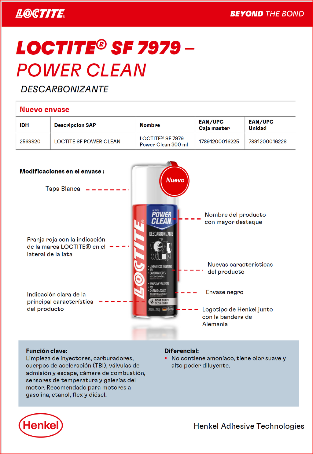 El Loctite SF 7979 Power Clean es un limpiador y descarbonizante de alto desempeño, formulado para eliminar rápida y eficazmente residuos de carbón, aceite, grasa y otros depósitos en componentes automotrices. Su fórmula de acción directa permite restaurar el funcionamiento de piezas críticas como carburadores, cuerpos de aceleración, válvulas, inyectores y sistemas de admisión, garantizando un mejor rendimiento del motor y reduciendo el consumo de combustible.